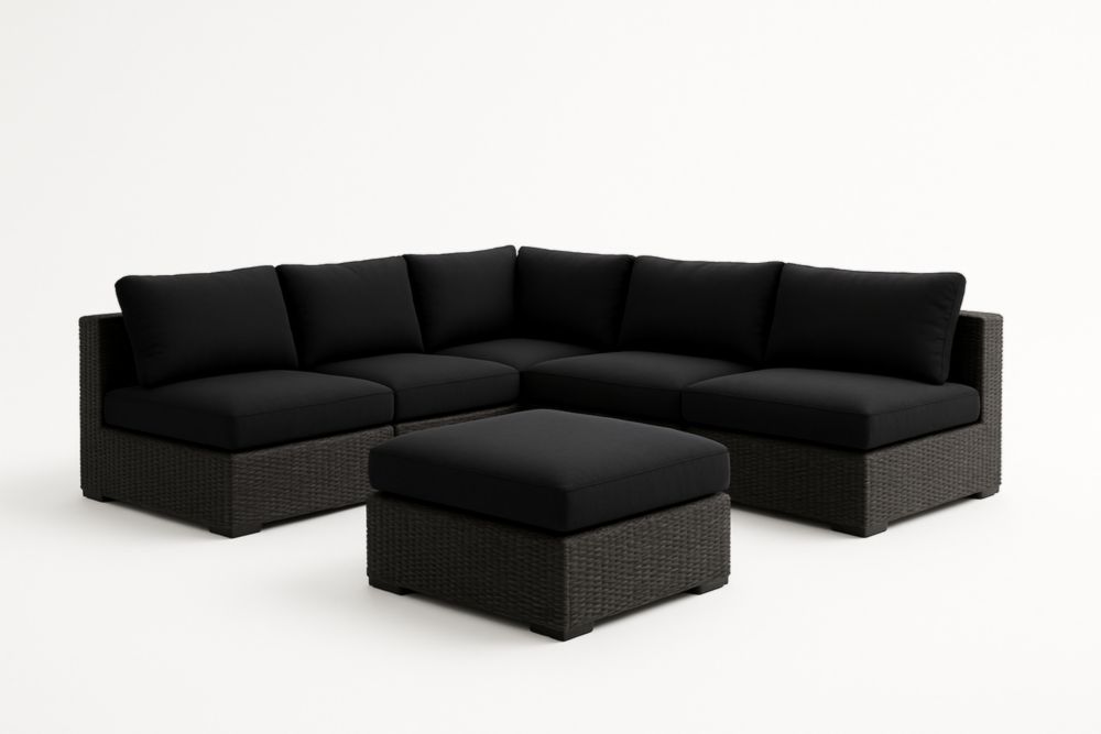 Divano angolare modulare in rattan sintetico con cuscini neri